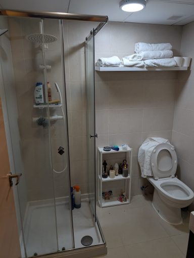 1 dormitorio con armario empotrado, un cuarto de baño equipado con ducha.
